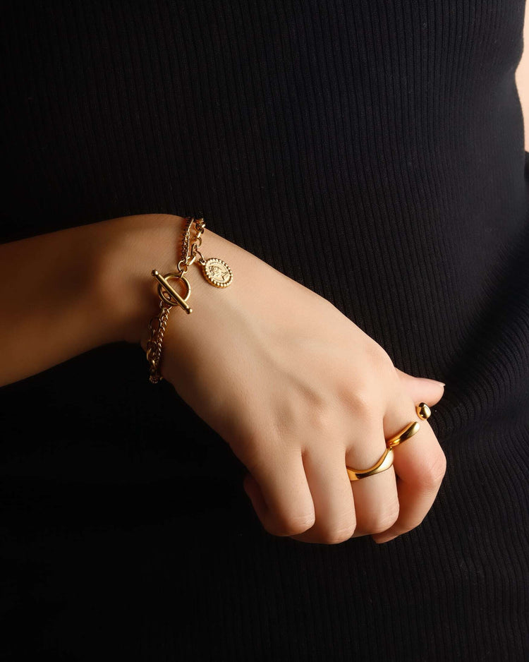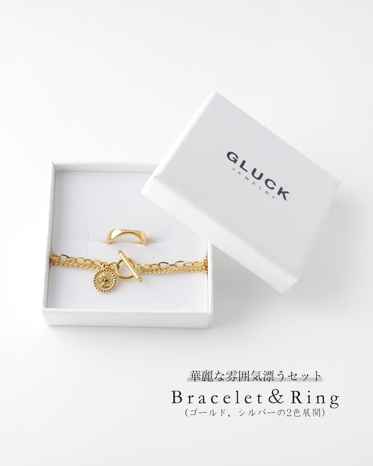 シンプルなフォルムのリングと、コインモチーフ付きのブレスレットを組み合わせた特別なセット。それぞれが持つ上品な輝きが、手元を華やかに演出します。単品でも楽しめ、重ねて身につければ一層存在感が際立つデザインです。