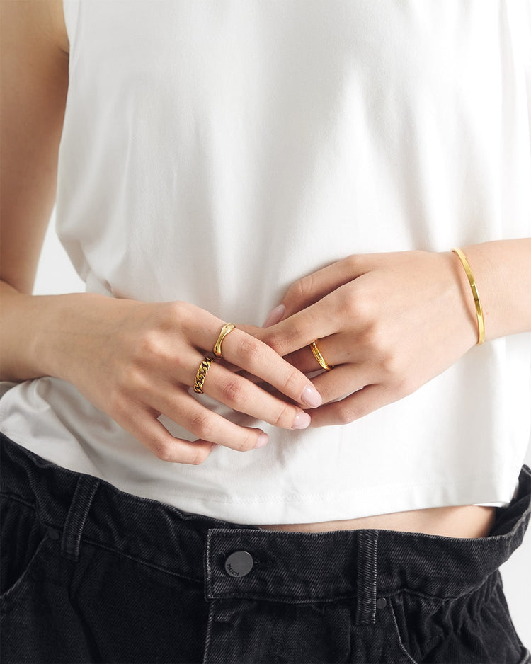 重ね付けしてスタイリングの幅を広げても、一つで存在感を放っても映える万能なデザイン。記念日のギフトにおすすめのリングです。